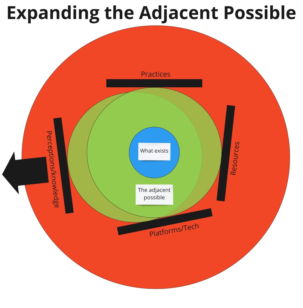 In innovation, the concept of the adjacent possible describes things that are within the current realm of possibility, and I’d describe its shape and size as contained by constraints, many of which are contextual. For example, some of the constraints I’ve shown in the image above: practices, perceptions, knowledge, technology, and resources. Something is within the realm of possibility if it doesn’t demand resources or knowledge we don’t have or technologies that don’t exist. It can’t demand that we behave in ways that are out of alignment with what could possibly be expected of us, and our behaviors are heavily modulated by perceptions, mental models, and knowledge.