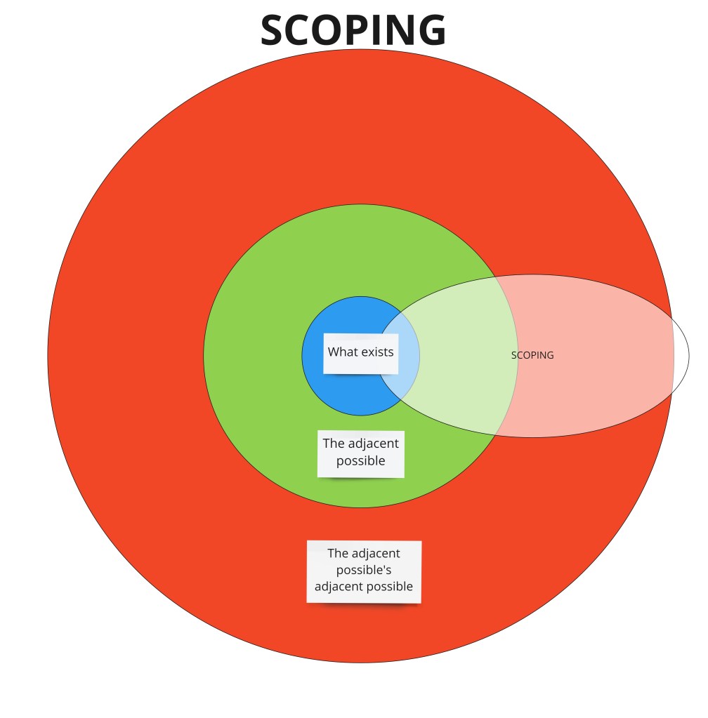 In the application of design and innovation methods like Design Thinking, Human Centered Design, Think Wrong, and countless others, a solid scoping effort will determine a lot of what is, a lot of what could be (the adjacent possible), and even more of what could be if things were slightly different (the AP’s AP).