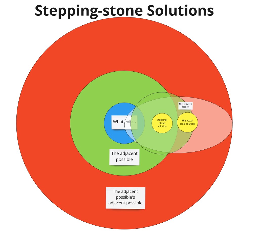 Sometimes, you identify a potential solution, but it’s outside the realm of possibility right now. In order for that solution to become possible, you need to create new possibilities–to expand the adjacent-possible. For example, if a solution wouldn’t be adopted because of cultural perceptions which impeded desirability… you could use another solution as a stepping stone. Your stepping stone solution could be an initiative that changes perceptions and culture. This might not seem like it directly solves the issue at hand, but it does open up the possibility for the actual goal to come within reach.