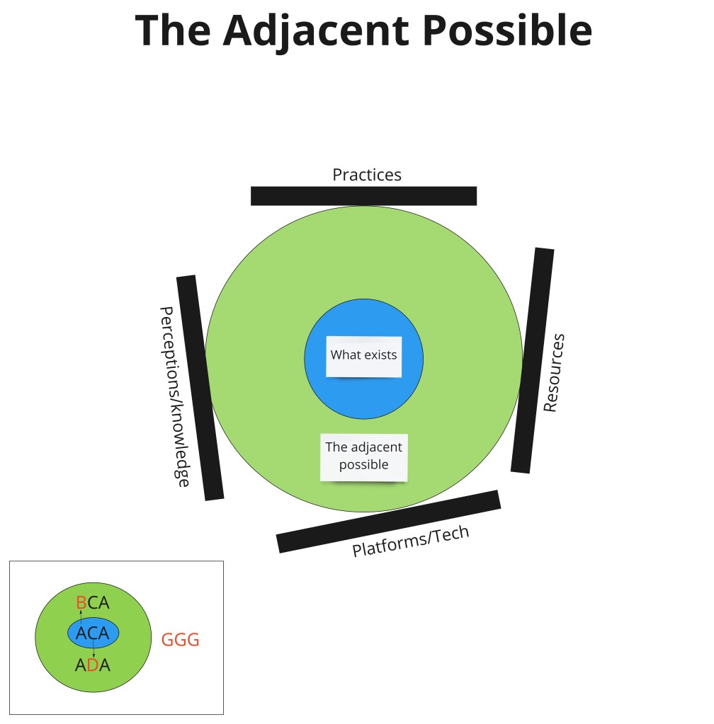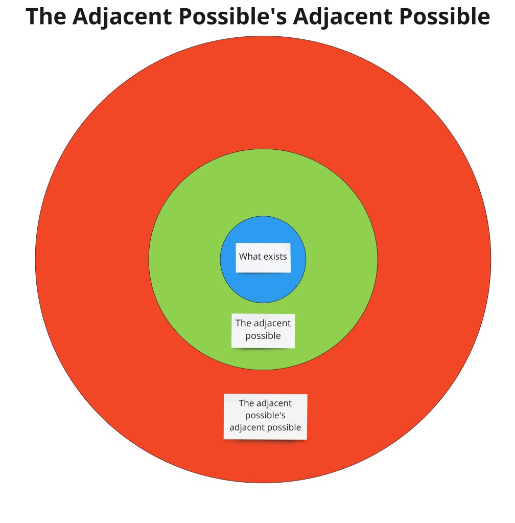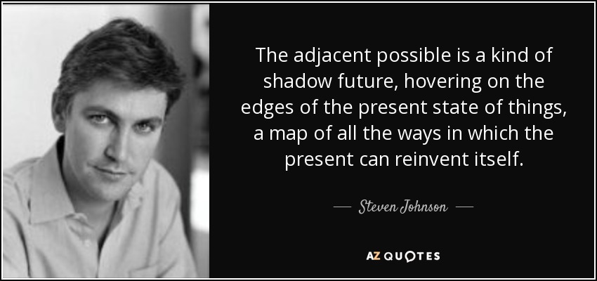 The author Steven Johnson describes the adjacent possible in innovation this way: “The adjacent possible is a kind of shadow future, hovering on the edges of the present state of things, a map of all the ways in which the present can reinvent itself…[the adjacent possible] captures both the limits and the creative potential of change and innovation.”