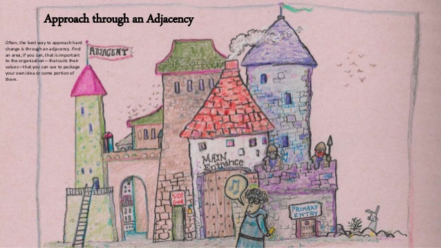 Exaptive innovation is like what Carmen Medina describes in her TEDx “How to be an organizational heretic” as “entering through an adjacency”: